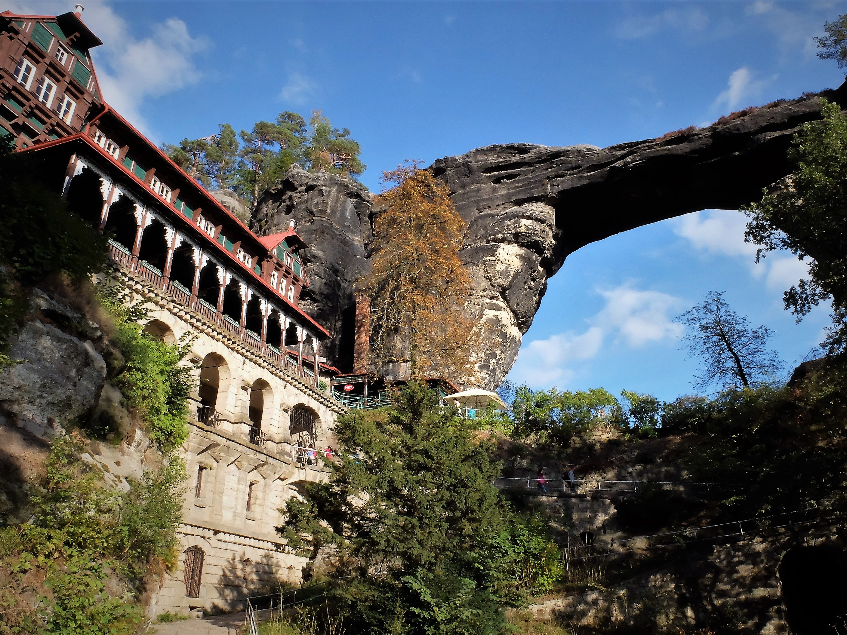 Mais adiante, o desfiladeiro se descortina em zigue-zague. O trajeto aquático transcorre entre árvores, até chegar ao magnífico arco de pedra que é chamado A Porta de Pravčická brána – marco natural mais importante da região, e o mais espetacular. A porta permanece escondida ao olhos, até chegarmos bem perto dela. Aparece de repente, e surpreende a todos. A primeira imagem é impactante, por conta do tamanho ponte e seu desafio à gravidade.