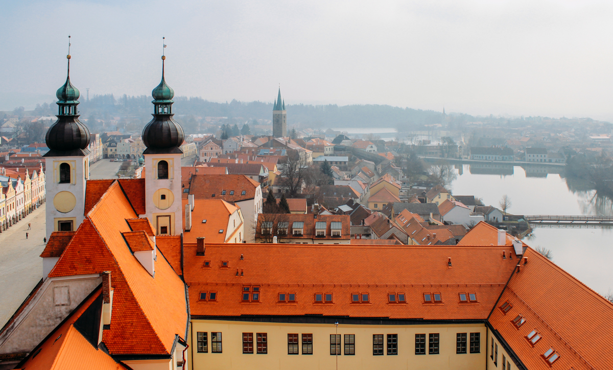 Desde o topo da torre, Telč é revelado em sua totalidade. Das alturas, você pode ver os canais que deram à cidade o apelido de “Veneza Tcheca”. Ao longe, são vistas as varandas coloridas e as torres das igrejas, com suas cúpulas abobadadas. De repente, ao lado da torre surge um jardim geométrico abraçado por grossas paredes. Ali fica o palácio dos Hradec, antigos senhores da cidade. As balaustradas do palácio são adornadas com afrescos que reproduzem escudos heráldicos.