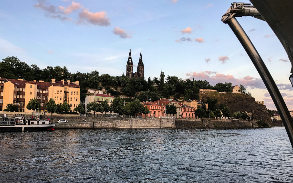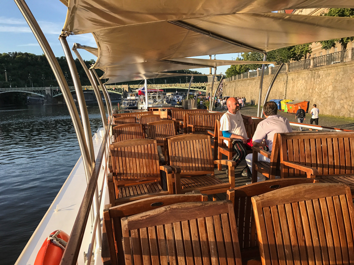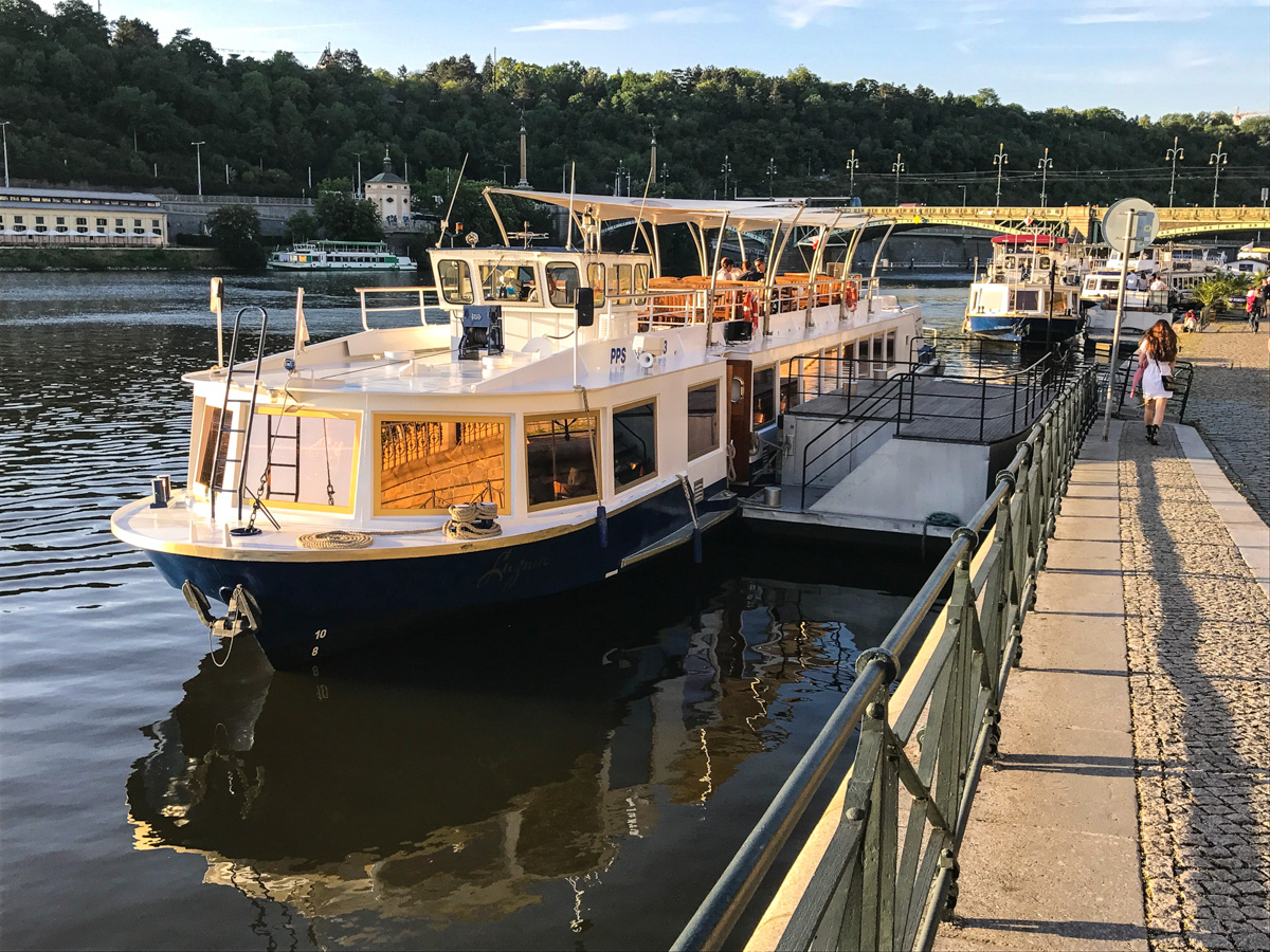 Um navio, o entardecer, um jantar, e Praga vista do Rio Moldava